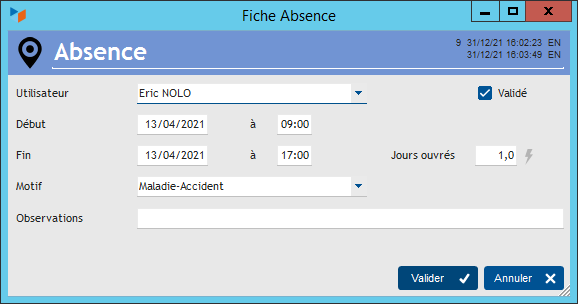 Si la case Validé 1 est cochée, l'absence ne pourra plus être modifiée (sauf dé-validation par un utilisateur ayant les privilèges d'administration des temps de travaux).