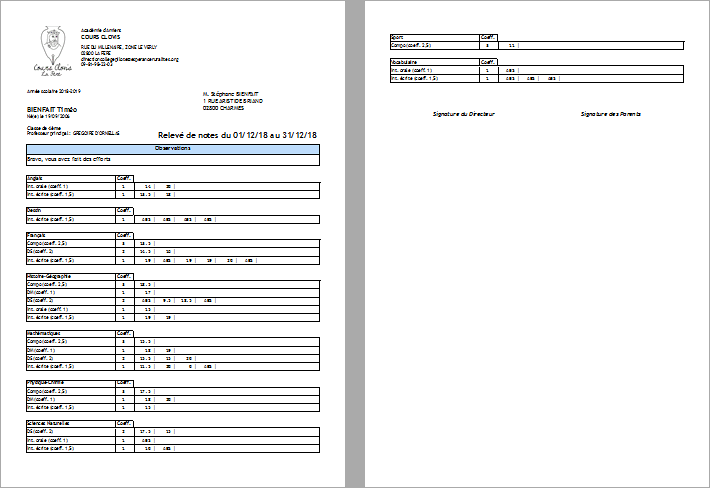 • enregistrement des notes des examens et impression des bulletins de notes