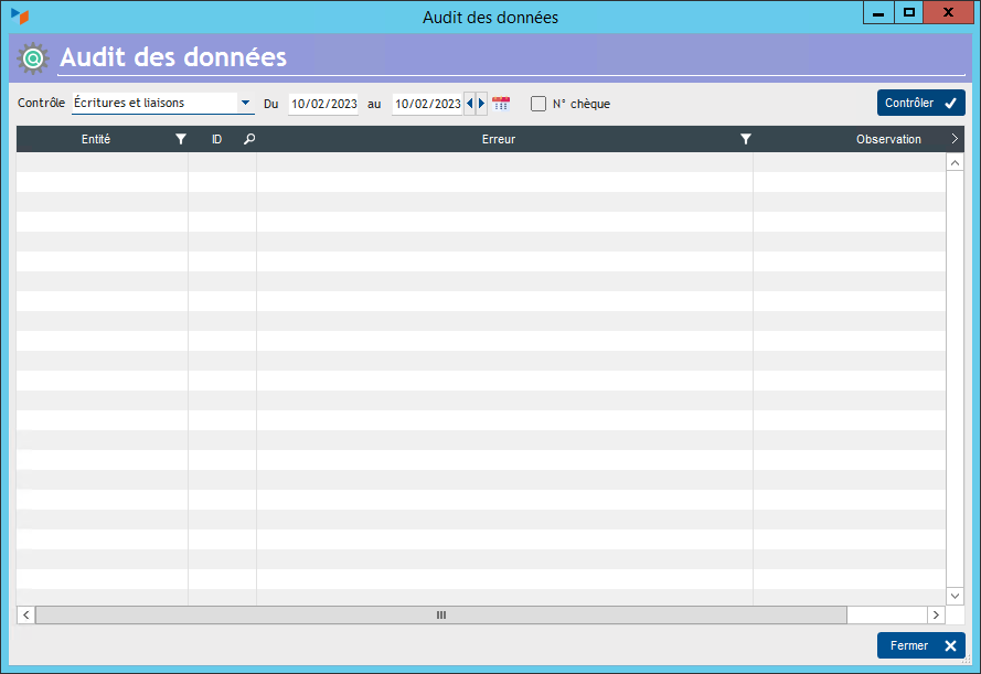 ou Comptabilité → Contrôles → Audit données (options compta uniquement).