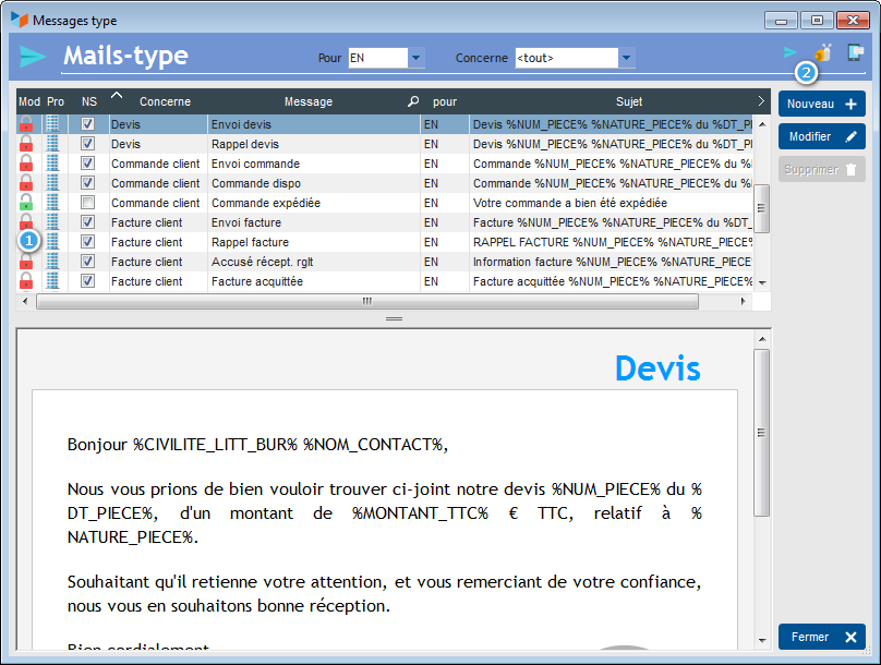 Il existe deux catégories de messages-type, différencié par la petite icone 1 :