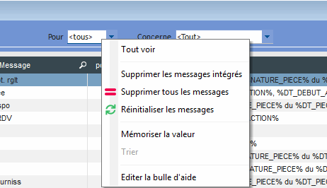 L'option Supprimer les messages intégrés permet de supprimer tous les messages intégrés de l'utilisateur, sauf ses messages spécifique. Cette option est là car dans les versions précédentes de Gestan, il n'y avait pas de messages “entreprise”. Elle sert donc à supprimer les anciens messages “utilisateur”, qui ont vocation à être remplacés par les messages type “entreprise”, sauf exceptions.