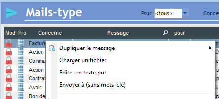 • Les messages-type intégrés, utilisés par Gestan pour les opérations “standard”, comme par exemple l'envoi d'une facture ou d'une fiche d'intervention. Vous pouvez les modifier, mais pas les supprimer (cadenas rouge).