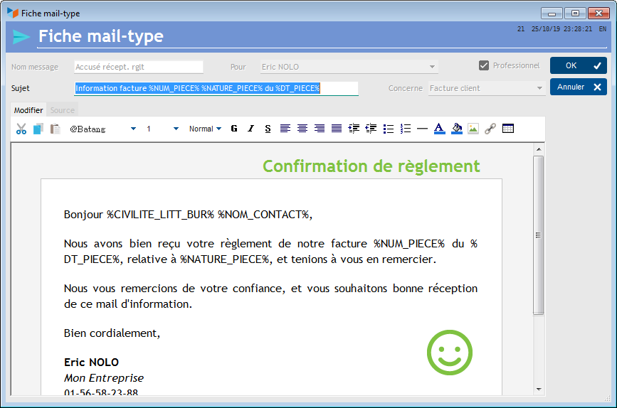 Accès : Entreprise→ Options utilisateur → Messages-types
