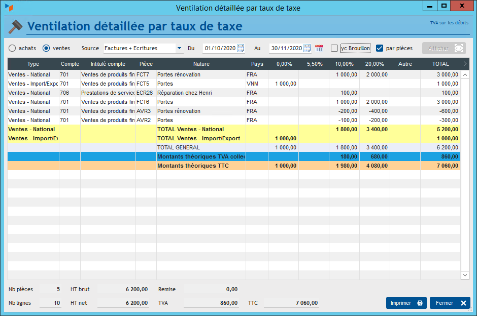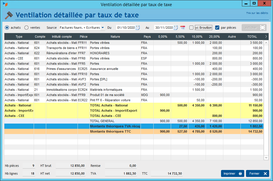 Cet écran présente la ventilation détaillée par taux de taxe, côté achats et côté ventes.