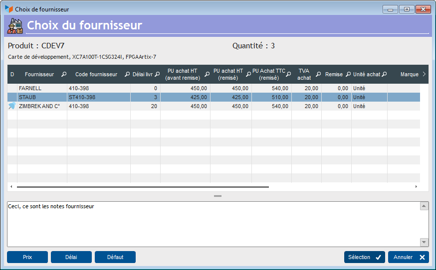 Si vous gérez les tarifs de vos fournisseurs avec Gestan, le logiciel va vous aider à sélectionner le meilleur fournisseur en fonction de vos critères, lorsque vous ferez des demandes de prix et des commandes fournisseur.
