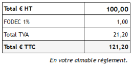 Prenons l'exemple d'un produit valant 100 HT, soumis à une TVA de 20%, et à une surtaxe type FODEC, au taux de 1%.