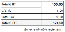 Les frais de port, constituant le prix d'un service effectif, n'est pas une surtaxe. Il est possible de les faire figurer dans le bloc des totaux, en déclarant la famille “Frais de port” dans l'onglet présentation du paramétrage des pièce. Ainsi, avec des frais de port de 10 HT sur l'exemple précédent, nous avons :