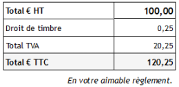 Prenons l'exemple d'un produit valant 100 HT, soumis à une TVA de 20%, et à droit de timbre de 0.25%. Ici, nous le calculons sur la base du HT.