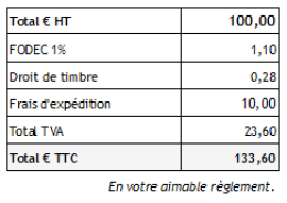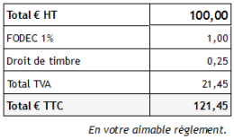 Voilà ce que ça donne avec un produit valant 100 HT, soumis à une TVA de 20%, et à une surtaxe type FODEC, au taux de 1%, et et à droit de timbre de 0.25% calculé sur le HT.