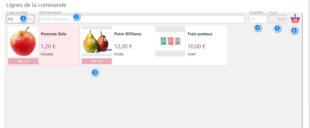 Vous pouvez saisir un code produit, ou un libellé produit dans les zones 1 ou 2. Les produits pouvant correspondre à la saisie seront alors affichés dans la zone 3. Vous pourrez alors saisir la quantité demandée en zone 4, la zone 5 vous affichant le stock disponible immédiatement.