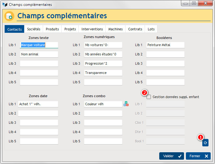 Pour les fichiers majeurs de Gestan (contacts, produits, machines, etc), il est possible de gérer des champs complémentaires spécifiques.