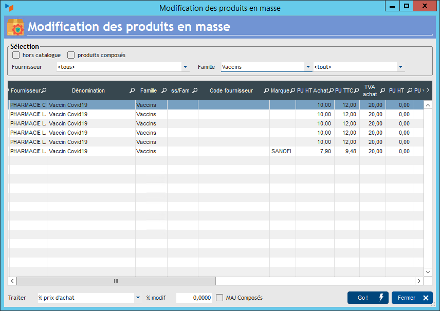 - % remise fournisseur : application d'un montant fixe comme remise fournisseur, et recalcul du prix d'achat. A compléter éventuellement d'une remise à jour des prix de vente.