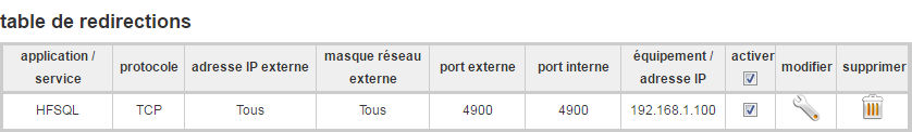 - Effectuer un forward de port sur son routeur-firewall. Il faut rajouter une règle dans le routeur qui spécifie que les connexions arrivant sur un port X depuis Internet seront transférées sur la machine hébergeant le serveur HFSQL sur le port 4900 (ou celui précisé dans HFConf.ini)