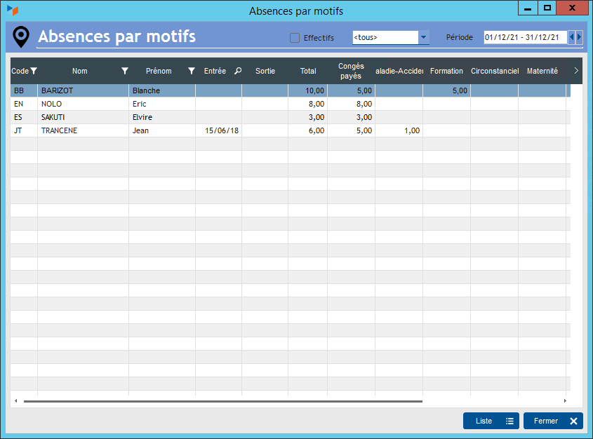 Cet écran totalise les jours d'absence, par motifs suivis.